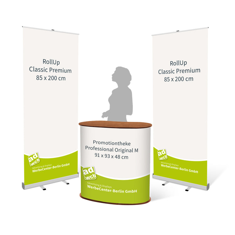 Zwei Roll-Up Displays (85 cm Breite) und eine Promotiontheke, jeweils inklusive Druck.