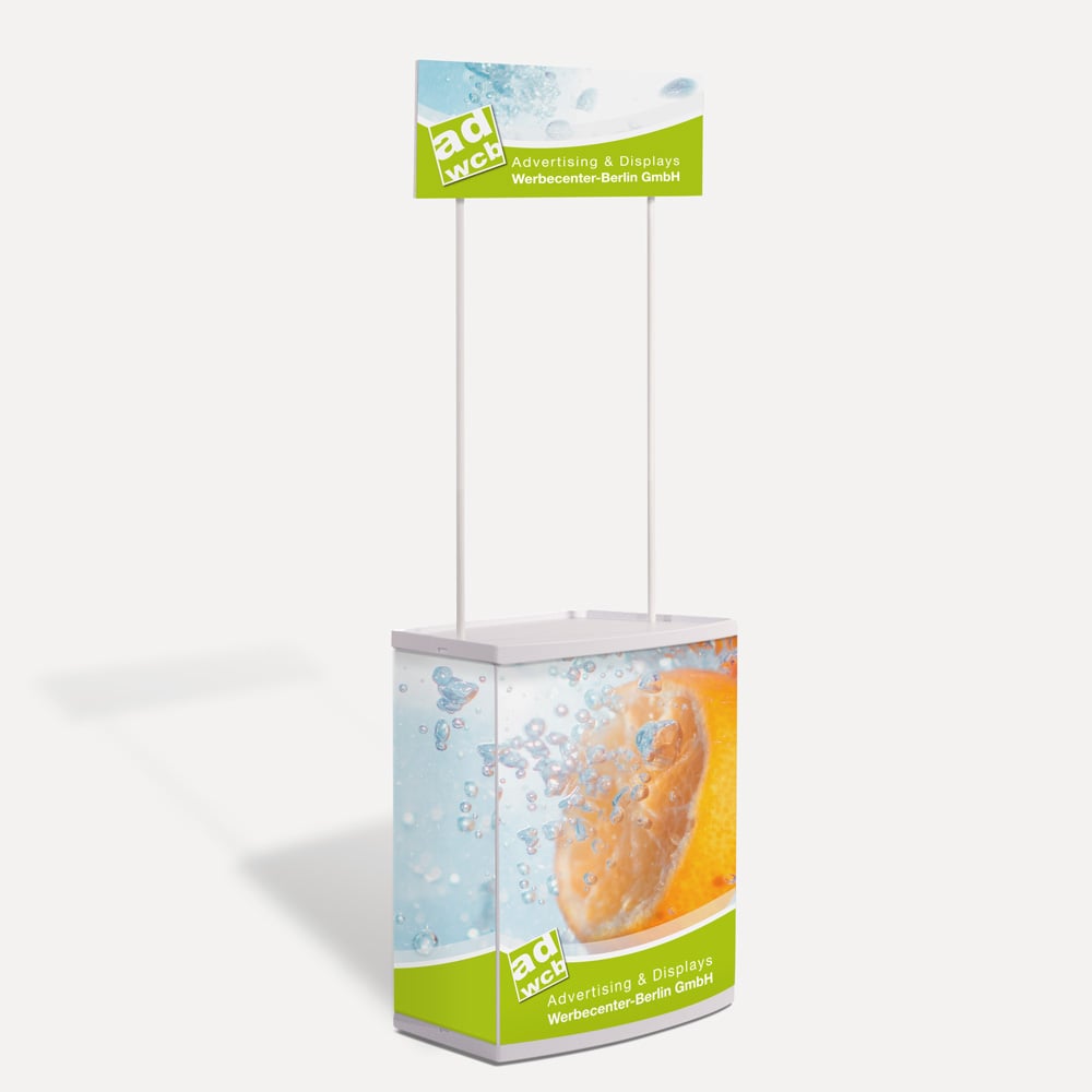 Die Promotiontheke „Promoter“ kombiniert eine großzügige Werbefläche mit einer stabilen Thekenlösung. Ideal für Promotion-Aktionen, Messen und Wahlveranstaltungen. Durch das integrierte Topschild ist Ihr Stand bereits aus der Ferne gut sichtbar.