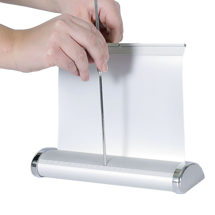 Das Mini Roll-Up ist in den Formaten A4 und A3 erhältlich und passt perfekt auf Theken, Tische oder Präsentationsflächen. Dadurch eignet es sich auch hervorragend als kleines Werbegeschenk oder aufmerksamkeitsstarker Hinweis im direkten Kundenkontakt.