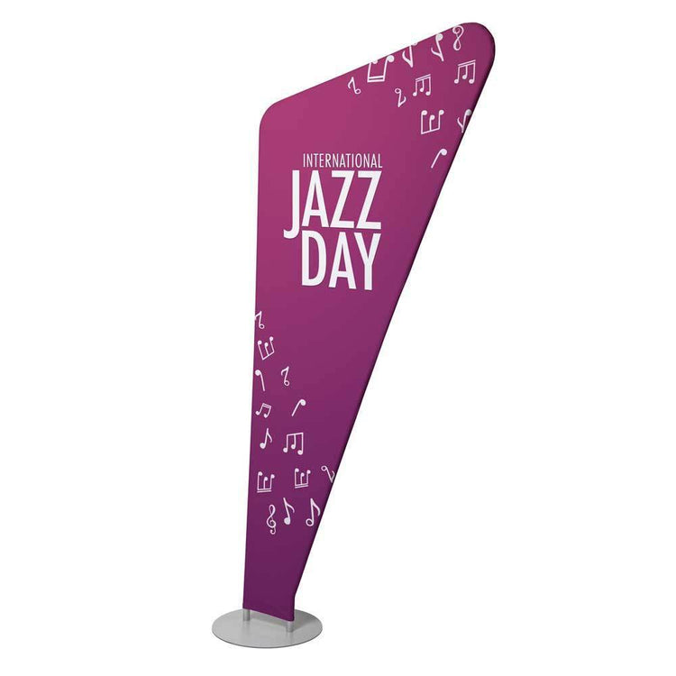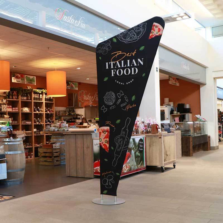 Einzigartige Kombination aus Fahne & Banner: Die „Triangle“-Form vereint die Eleganz einer Textilfahne mit der großflächigen Wirkung eines Bannerdrucks – modern, leicht und äußerst aufmerksamkeitsstark.